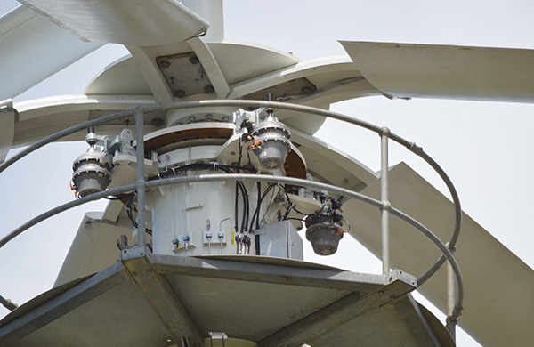 As an alternative to its electrical brakes, RINGSPANN offers numerous series with pneumatic and hydraulic brakes. Shown in the picture for example are the brake caliper HS 075 FHM (spring-activated/hydraulically released) in a wind power plant of the type Pioneer Wincon P750/49. (Image: Pioneer Wincon).